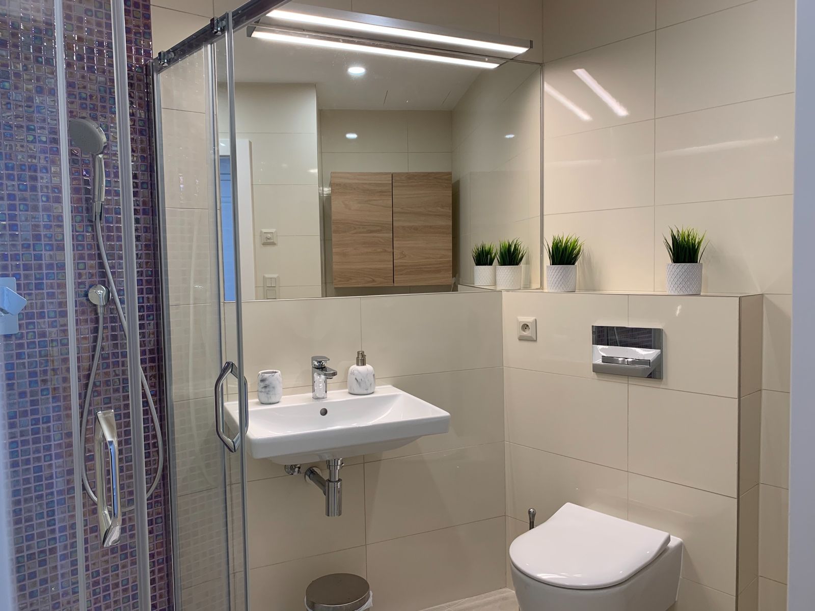 kuchyňská linka lednice pračka stůl a židle manželské lůžko sklokeramická deska boiler sprchový kout |