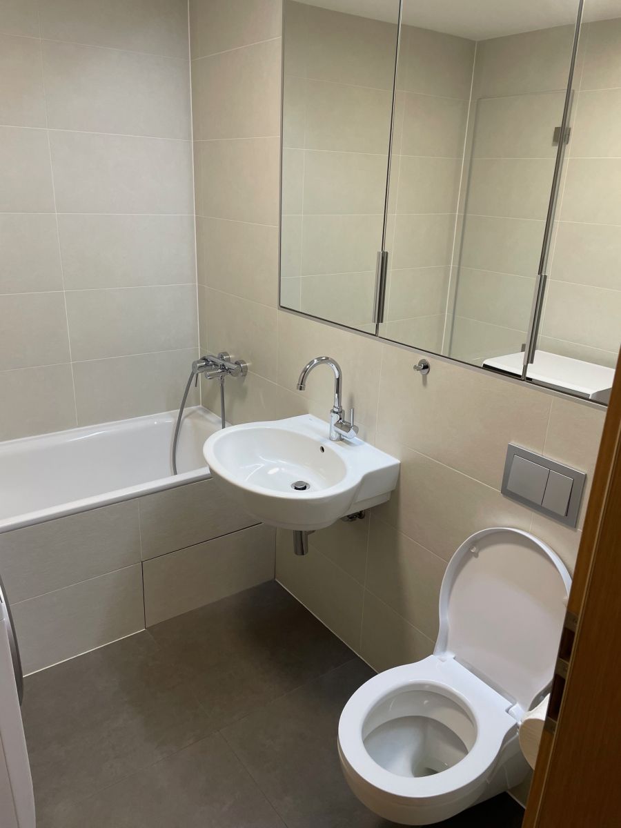 Koupelna v neutrální barvě je vybavena vanou, pračkou, koupelnovým žebříkem, vestavěnou zrcadlovou skříní a vyhřívanou podlahou.