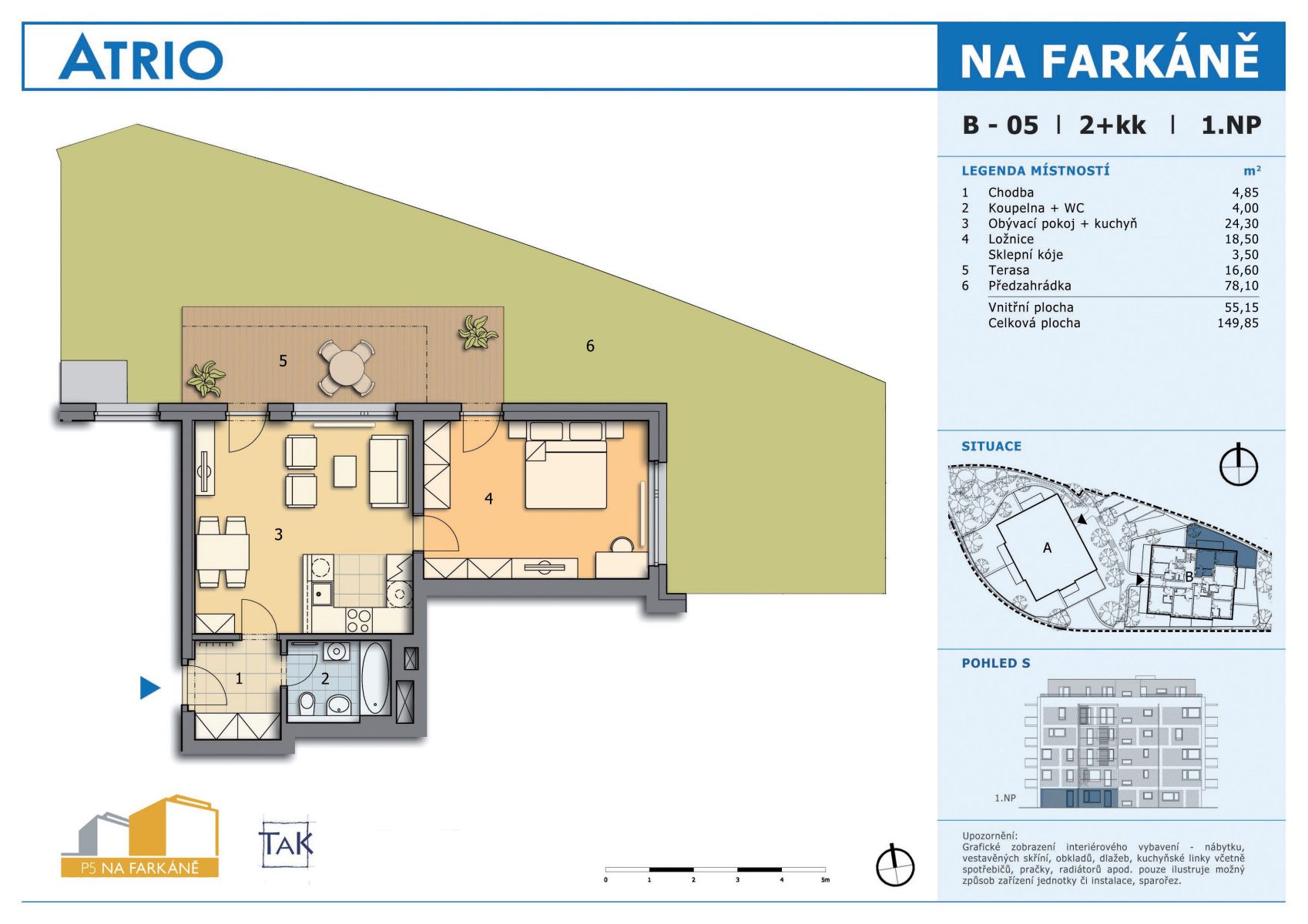 V žádané velmi klidné lokalitě pražské Farkáně, kousek od Anděla, nabízíme k dlouhodobému pronájmu byt 2+kk v projektu Rezidence Na Farkáně. Byt v přízemí ve vysokém standardu nabízí rozlohu 53 m² + 3 m² sklep + 16 m² terasu + 80 m² zahradu a garážové parkovací stání v zakladači. Dispozici bytu tvoří obývací pokoj s kompletně vybavenou kuchyní s dostatkem úložného prostoru a pracovní plochy, kombinovanou troubou s mikrovlnkou, indukční deskou, myčkou nádobí a lednicí. V obývacím pokoji je dále k dispozici rozkládací pohovka, televize, jídelní stůl a masivní dubová knihovna. Z obývacího pokoje je přímý vstup na zastřešenou terasu, kterou lze od jara do podzimu využívat jako rozšíření obývacího pokoje a která poskytuje velkou míru soukromí. Ideální pro pohodový začátek dne s kávou nebo večerní posezení s přáteli. Zároveň je možné zahradu využít k pěstování vlastní zeleniny, ovoce a bylinek, jsou zde k dispozici 2 vyvýšené záhony. Na zahradě je navíc k dispozici kůlna pro uložení sezónních věcí, které chcete mít po ruce.
